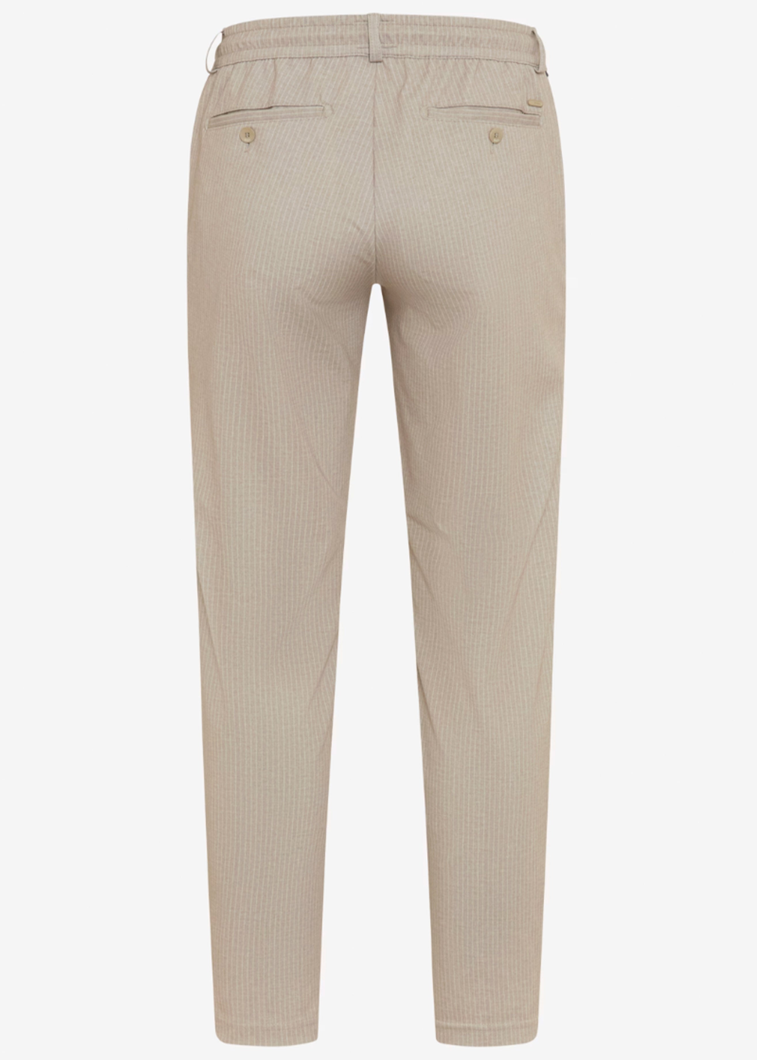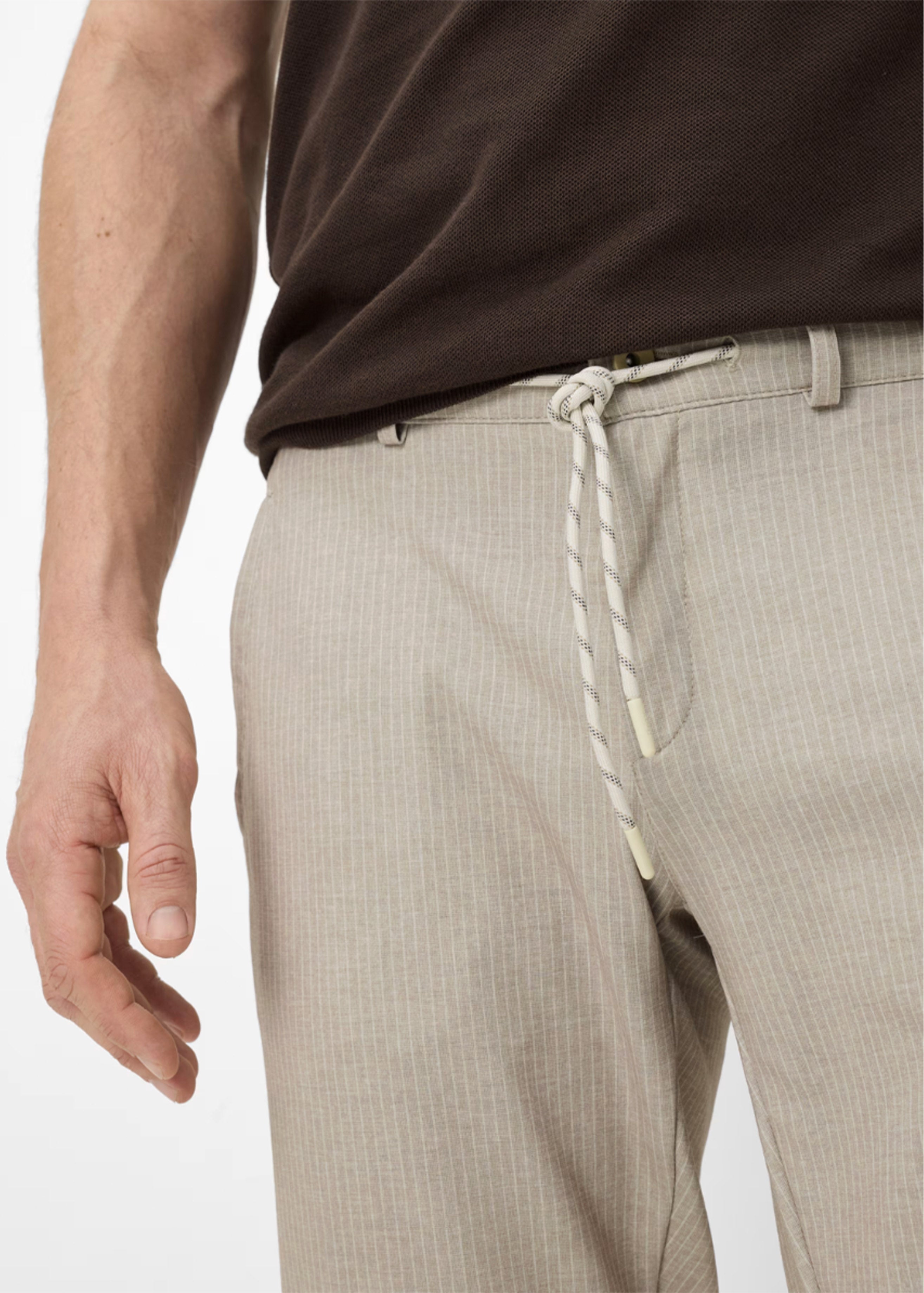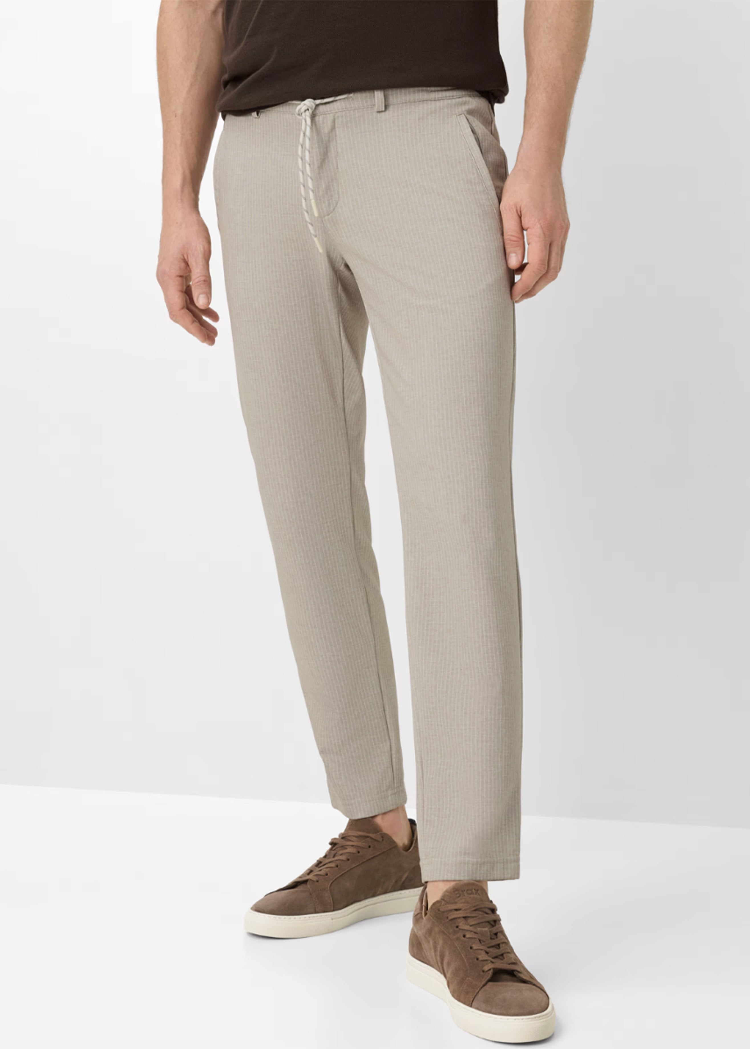 Casual, modern, and finely detailed – the Phil-style chino brings a fresh vibe to your look. Its straight, slightly tapered silhouette in a tapered fit creates a contemporary line that allows for movement while still looking polished. Front slash pockets and buttoned welt back pockets emphasize the classic character. The partially elastic waistband with an integrated drawcord, usable inside or outside, gives the pants a smart, sporty finish. The subtle vertical stripe pattern adds a refined texture that combines elegance and ease effortlessly. The high-quality jersey blend delivers a pleasantly soft feel that sits smoothly against the skin and stays in shape thanks to its elastic fibers. With innovative Hi-FLEX technology, the chino shows off its functional side – maximum freedom of movement, superior comfort, and a polished look come together to create an essential all-rounder for everyday wear and leisure.