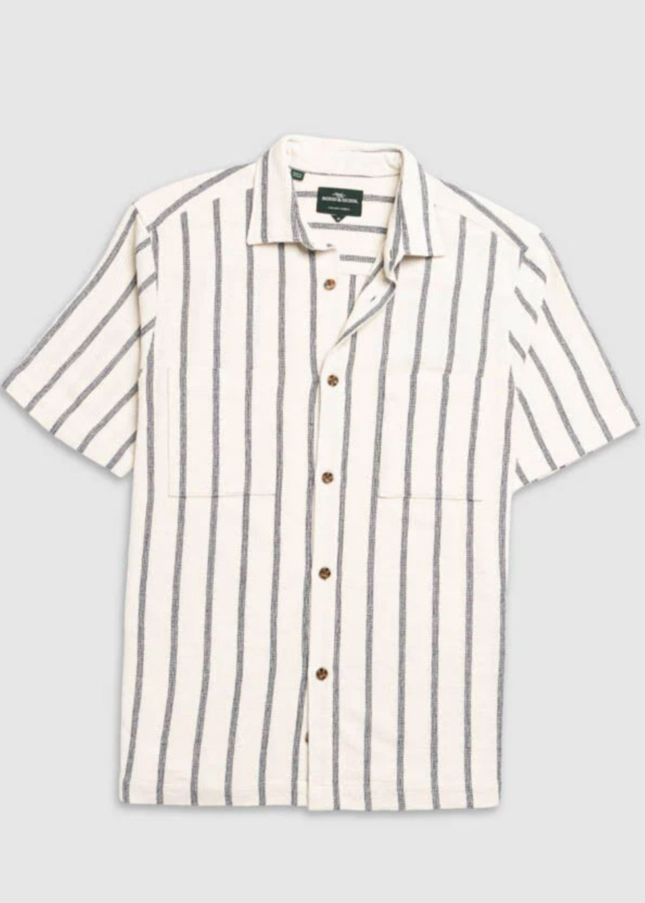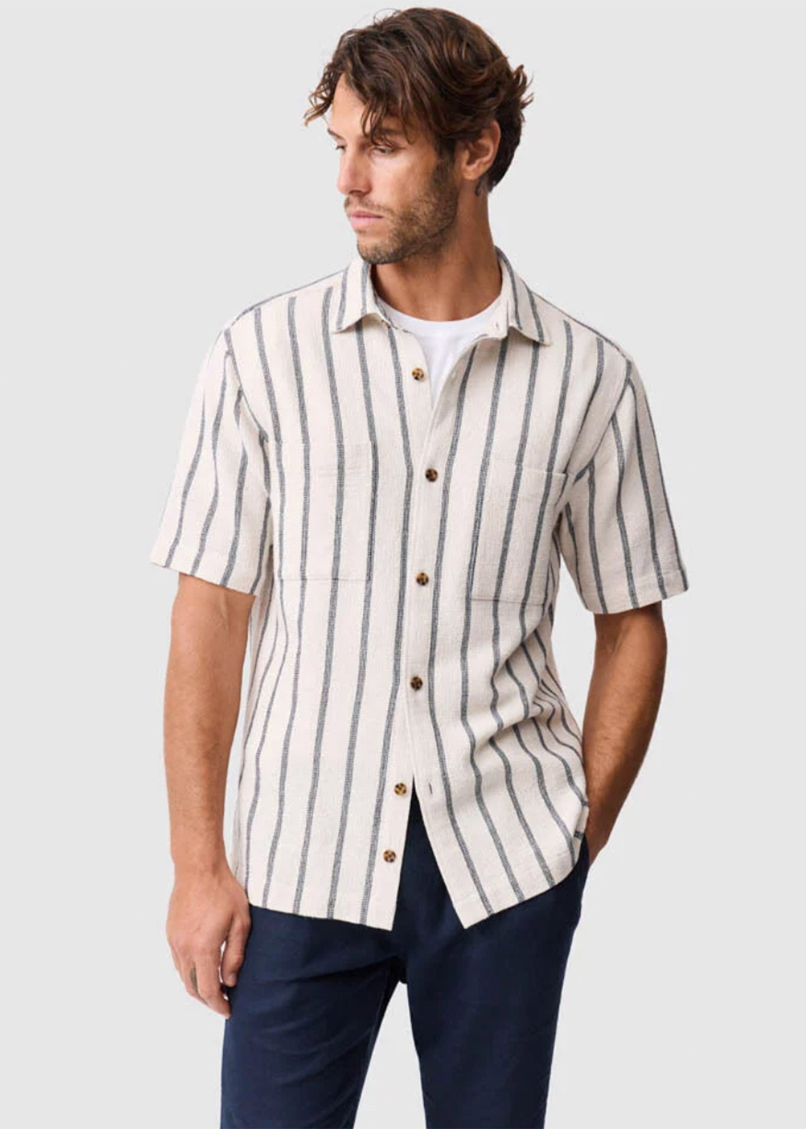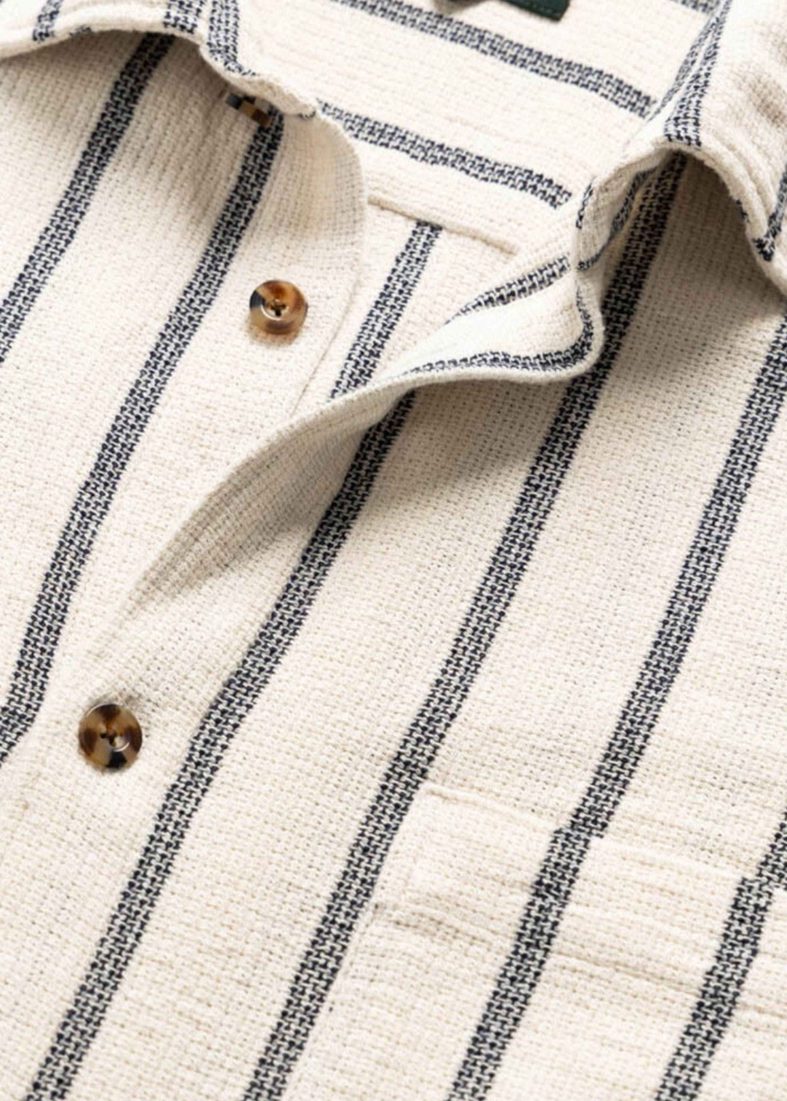 The perfect choice for warm weather, this men's short sleeve shirt, featuring an elegant ink stripe, offers both comfort and a relaxed aesthetic. Crafted from a premium European cotton blend, the fabric is expertly milled in Italy by the renowned Manteco mill. Its distinctive open-net weave ensures enhanced breathability, making it ideal for warmer days. Cut in an Original Fit, it presents a fuller profile designed for comfort and everyday wear. Thoughtful details include a point collar with removable collar stays, practical double patch chest pockets, and a front placket opening adorned with refined tortoiseshell buttons. Reinforced seams provide lasting durability, while knife pleats allow for a greater range of motion. The shirt is also pre-washed for exceptional softness. Pair it with your favourite chinos or linen shorts for a polished yet relaxed casual look.