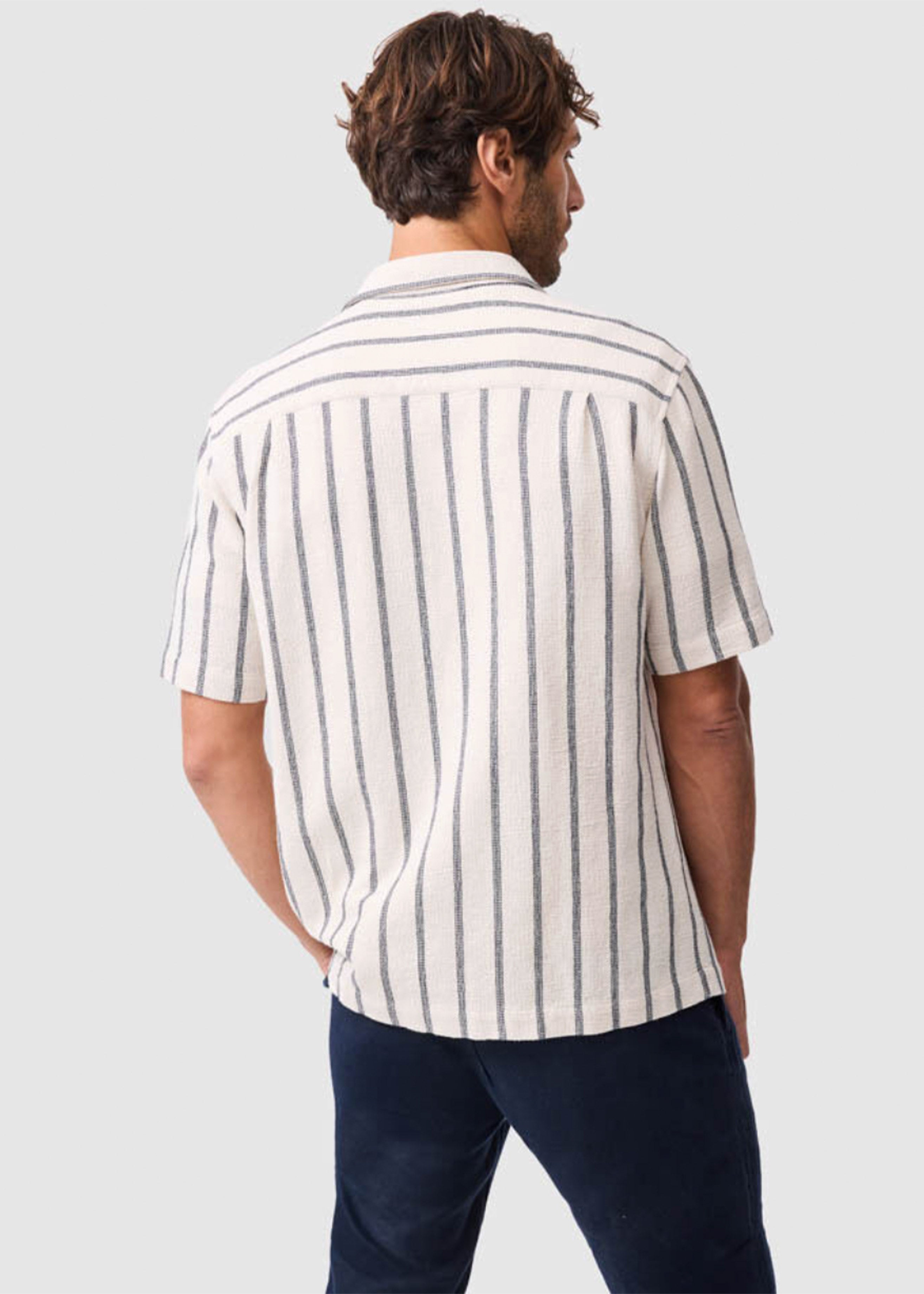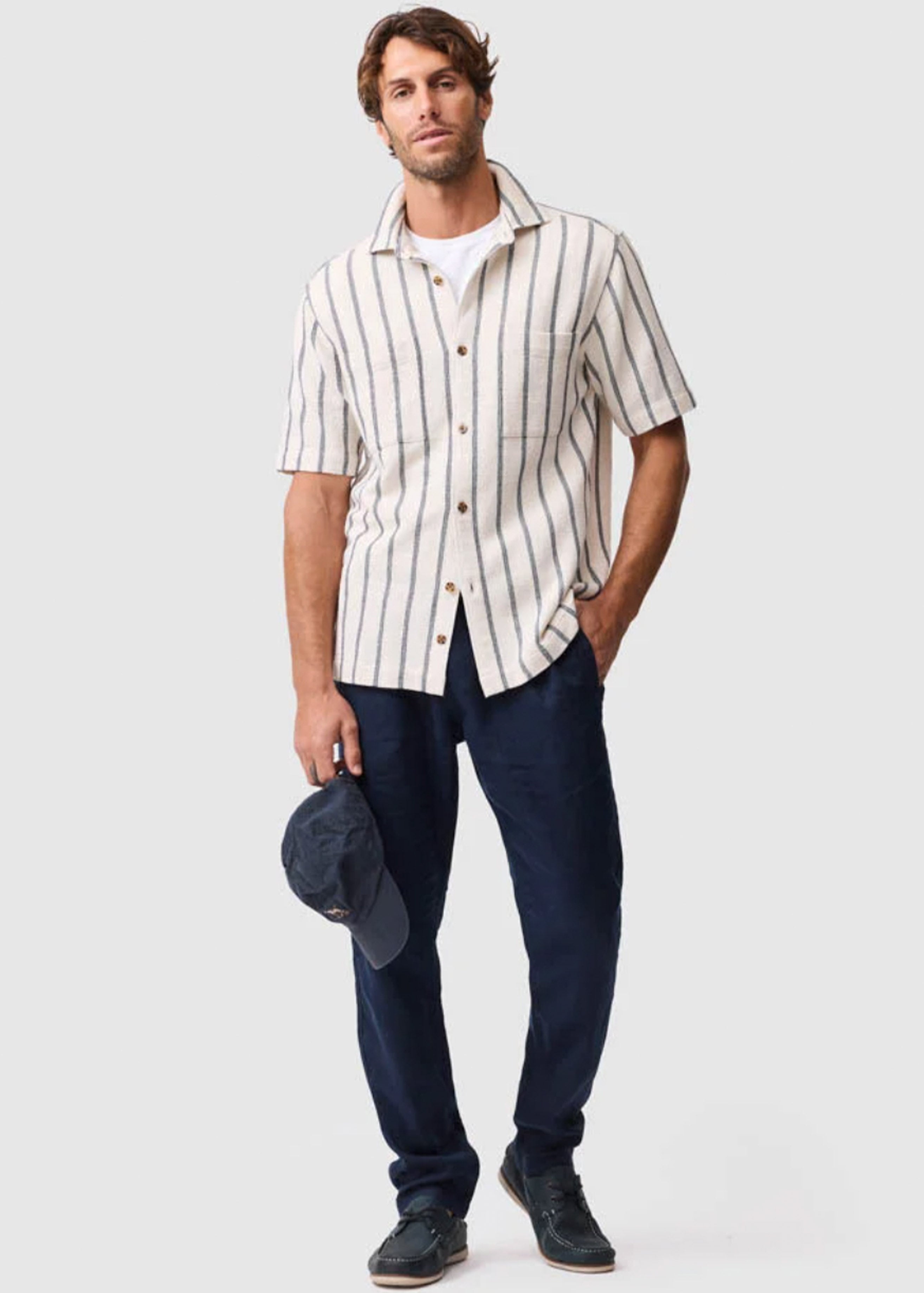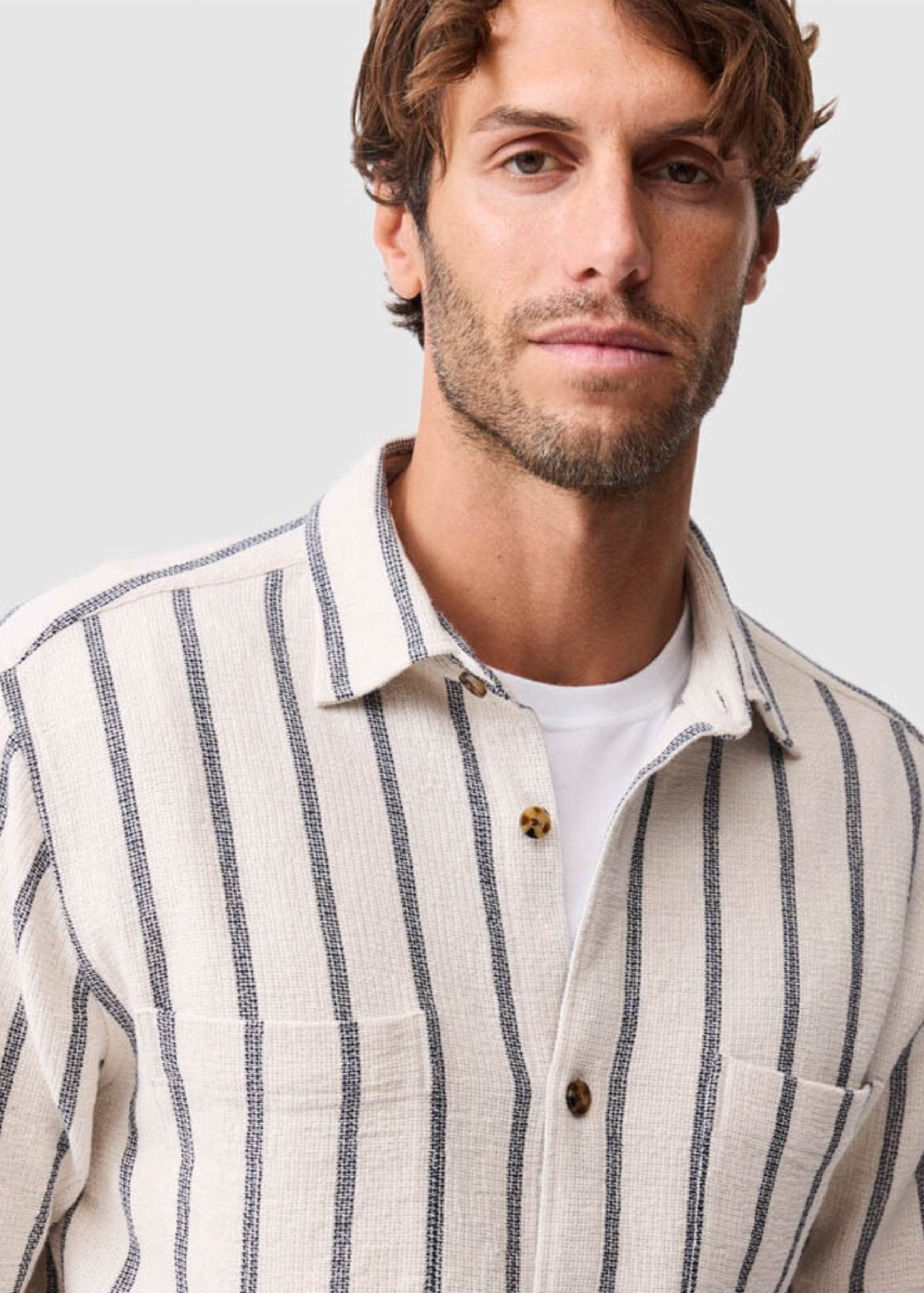 The perfect choice for warm weather, this men's short sleeve shirt, featuring an elegant ink stripe, offers both comfort and a relaxed aesthetic. Crafted from a premium European cotton blend, the fabric is expertly milled in Italy by the renowned Manteco mill. Its distinctive open-net weave ensures enhanced breathability, making it ideal for warmer days. Cut in an Original Fit, it presents a fuller profile designed for comfort and everyday wear. Thoughtful details include a point collar with removable collar stays, practical double patch chest pockets, and a front placket opening adorned with refined tortoiseshell buttons. Reinforced seams provide lasting durability, while knife pleats allow for a greater range of motion. The shirt is also pre-washed for exceptional softness. Pair it with your favourite chinos or linen shorts for a polished yet relaxed casual look.
