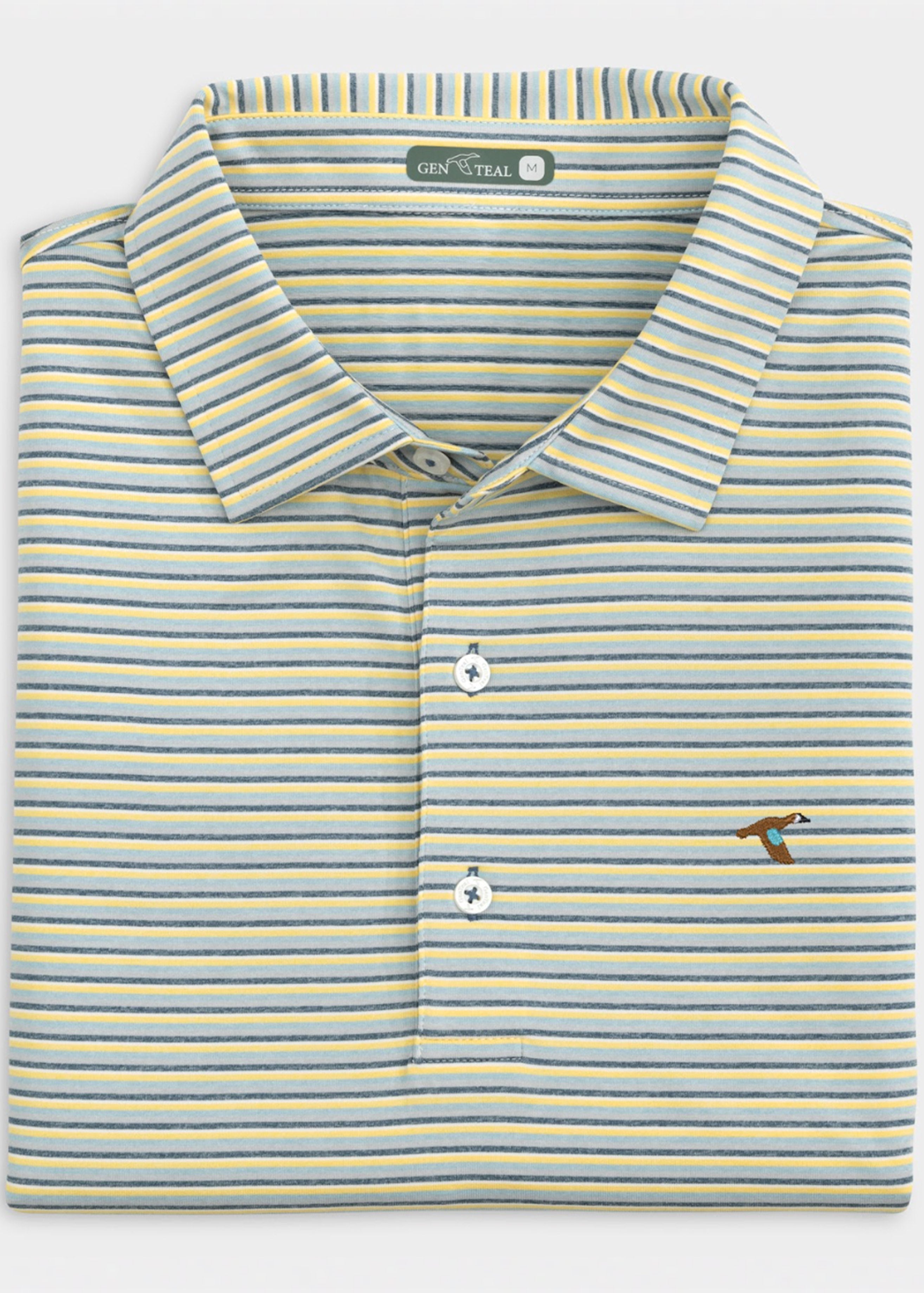 The Barstow Performance Polo pairs a yellow and navy heathered stripe with our signature Blue-winged Teal logo embroidered at the left chest for a refined finish. Crafted from a lightweight performance fabric, it delivers breathable comfort, moisture-wicking capability, and just the right amount of stretch for all-day ease. A structured collar and classic fit keep the look sharp from the course to casual weekends.