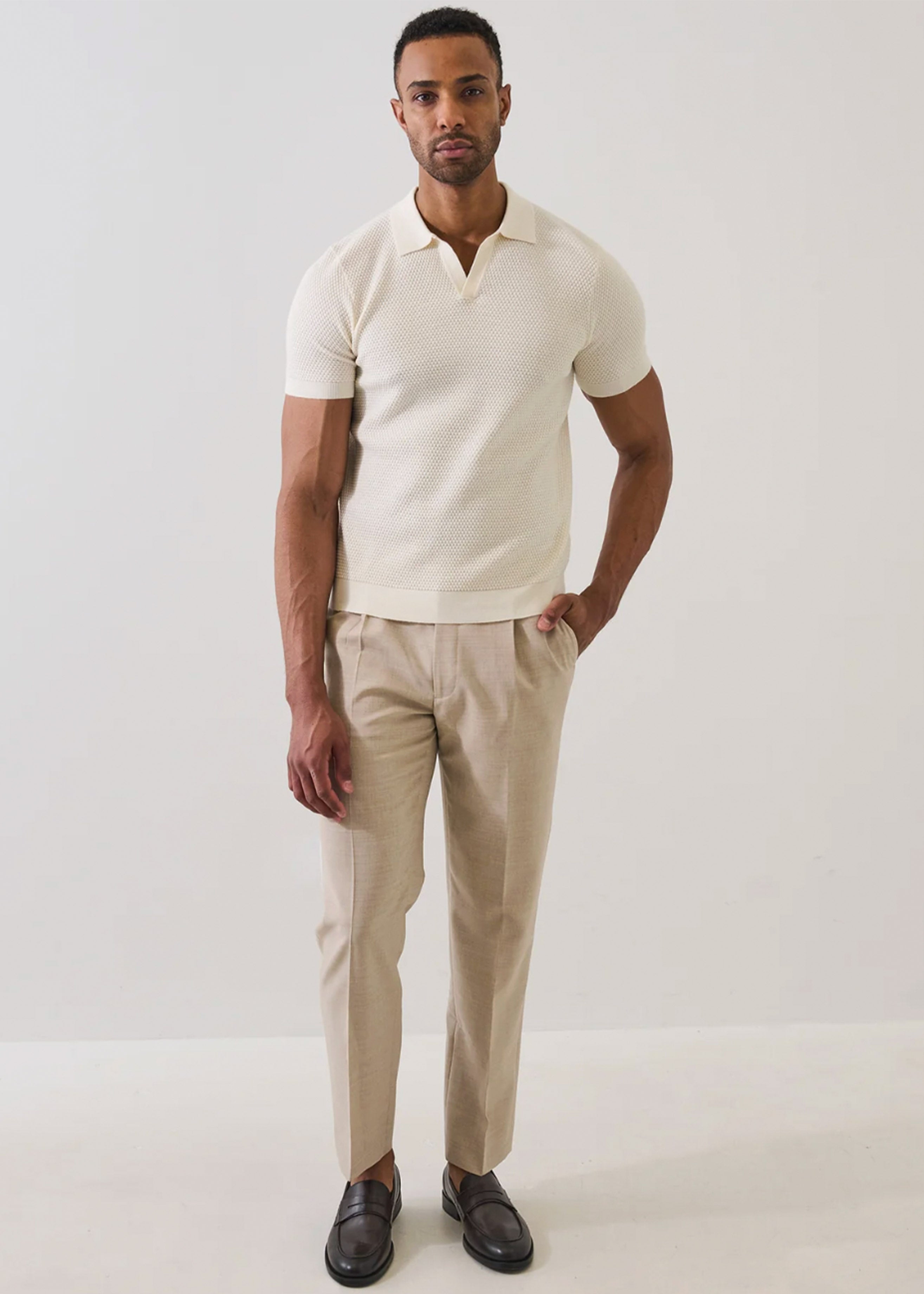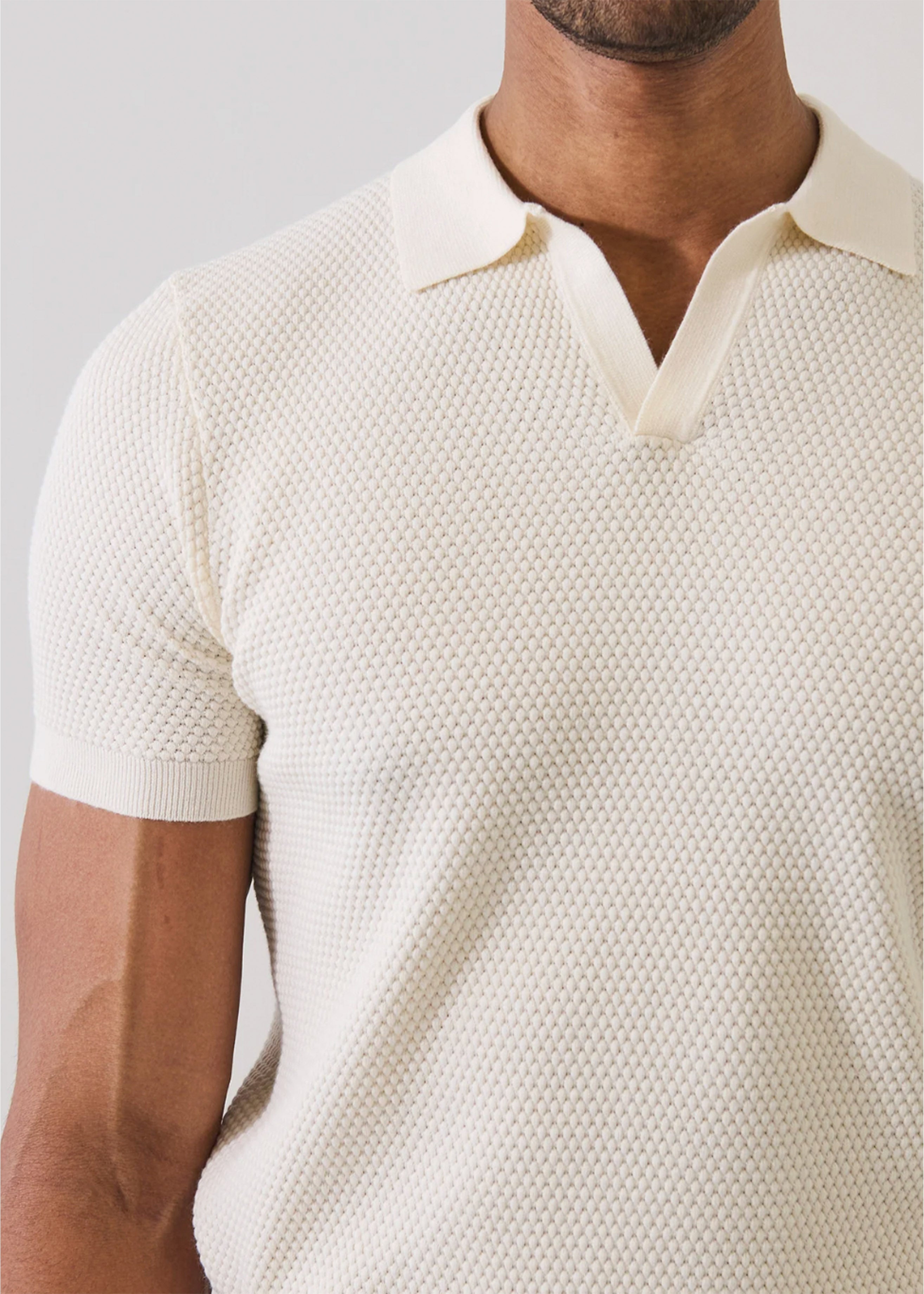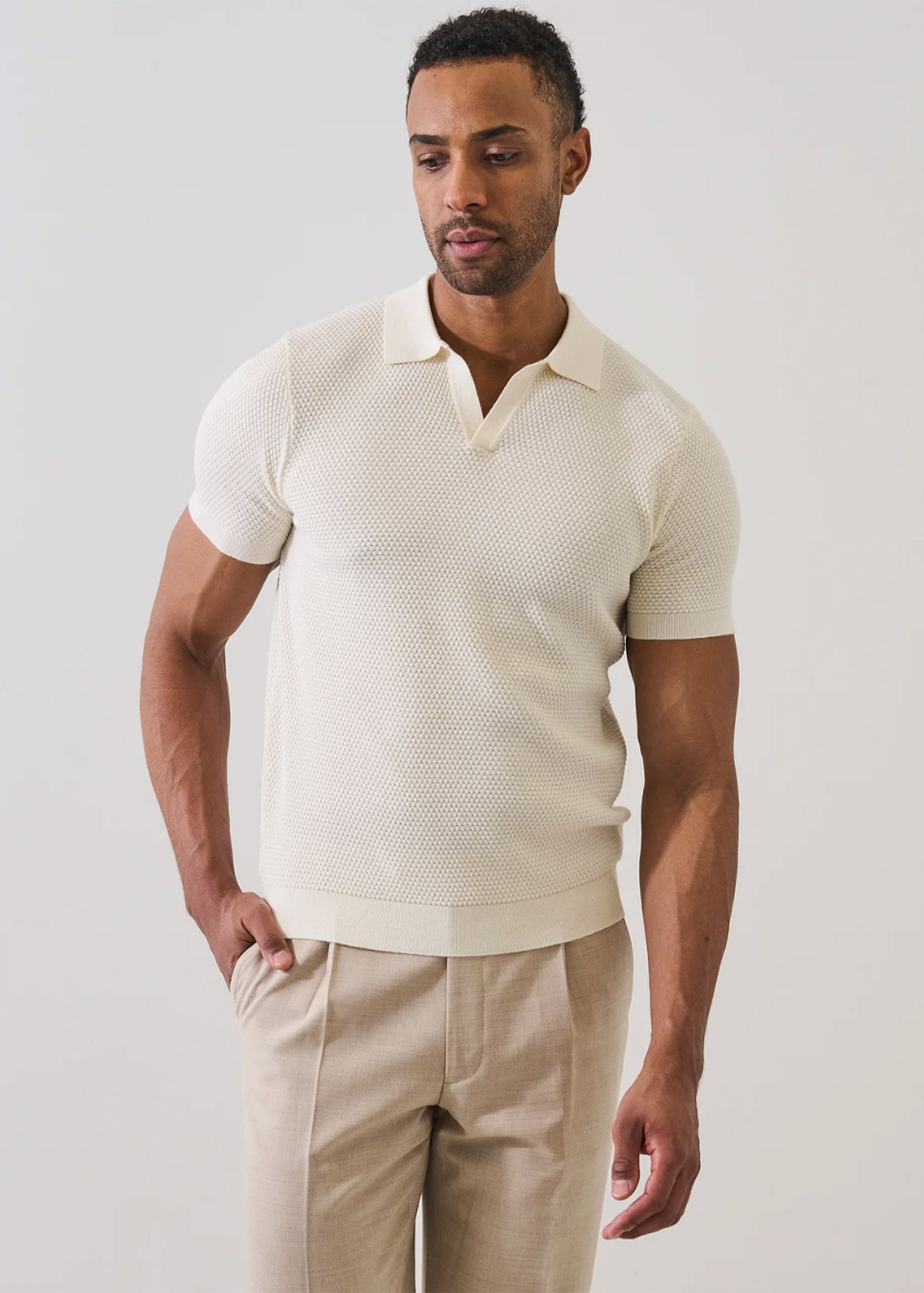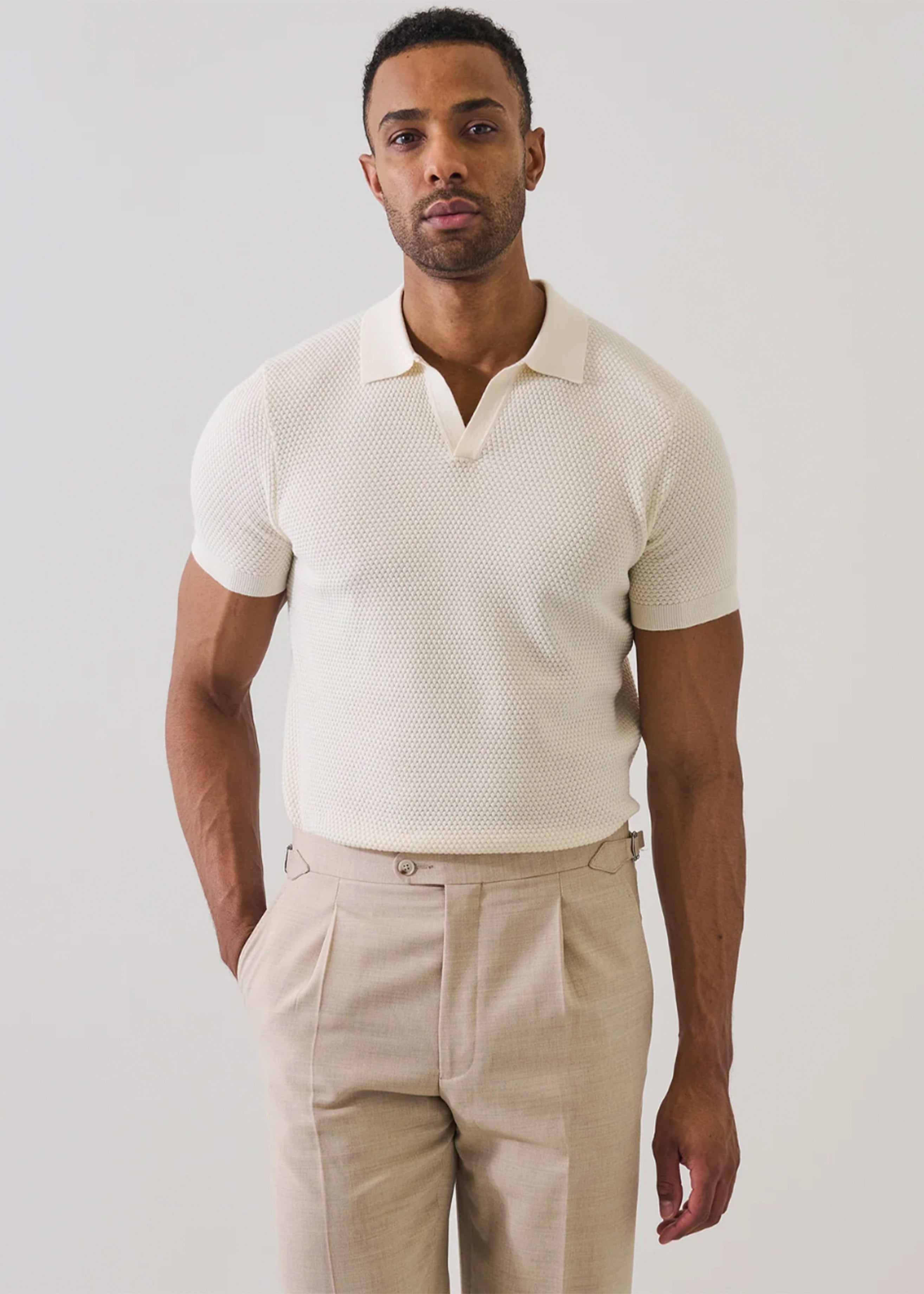 This bubble-stitch short-sleeve open polo introduces rich, three-dimensional texture that adds depth and visual interest to the silhouette. An important direction for the Spring-Summer season, this dimensional knit elevates casual dressing, creating outfits that feel polished yet relaxed.Crafted from our luxuriously soft cotton-cashmere yarn, it delivers a refined hand and lightweight comfort, balancing tactile character with effortless sophistication.