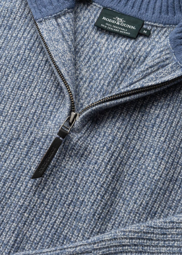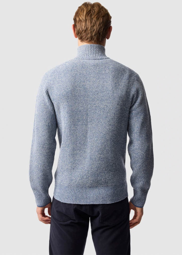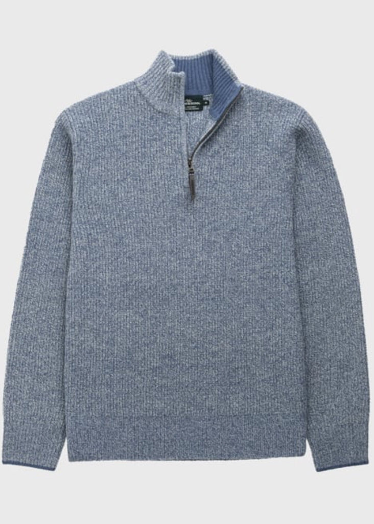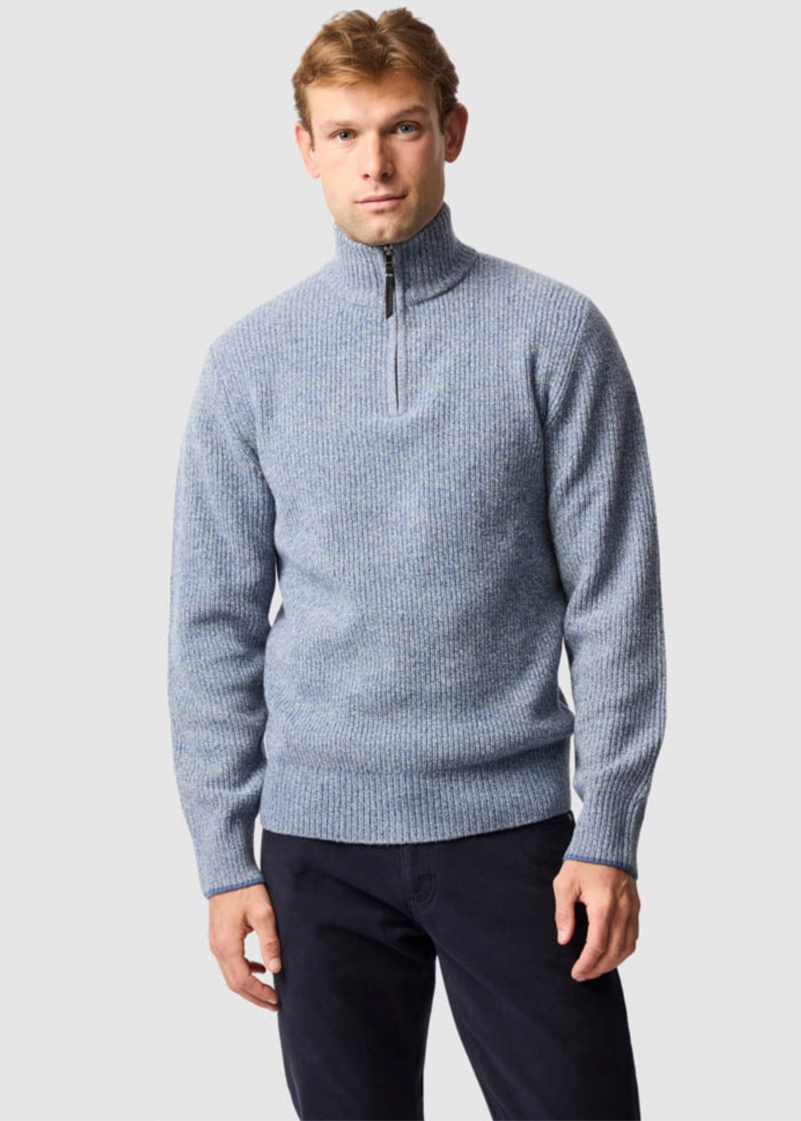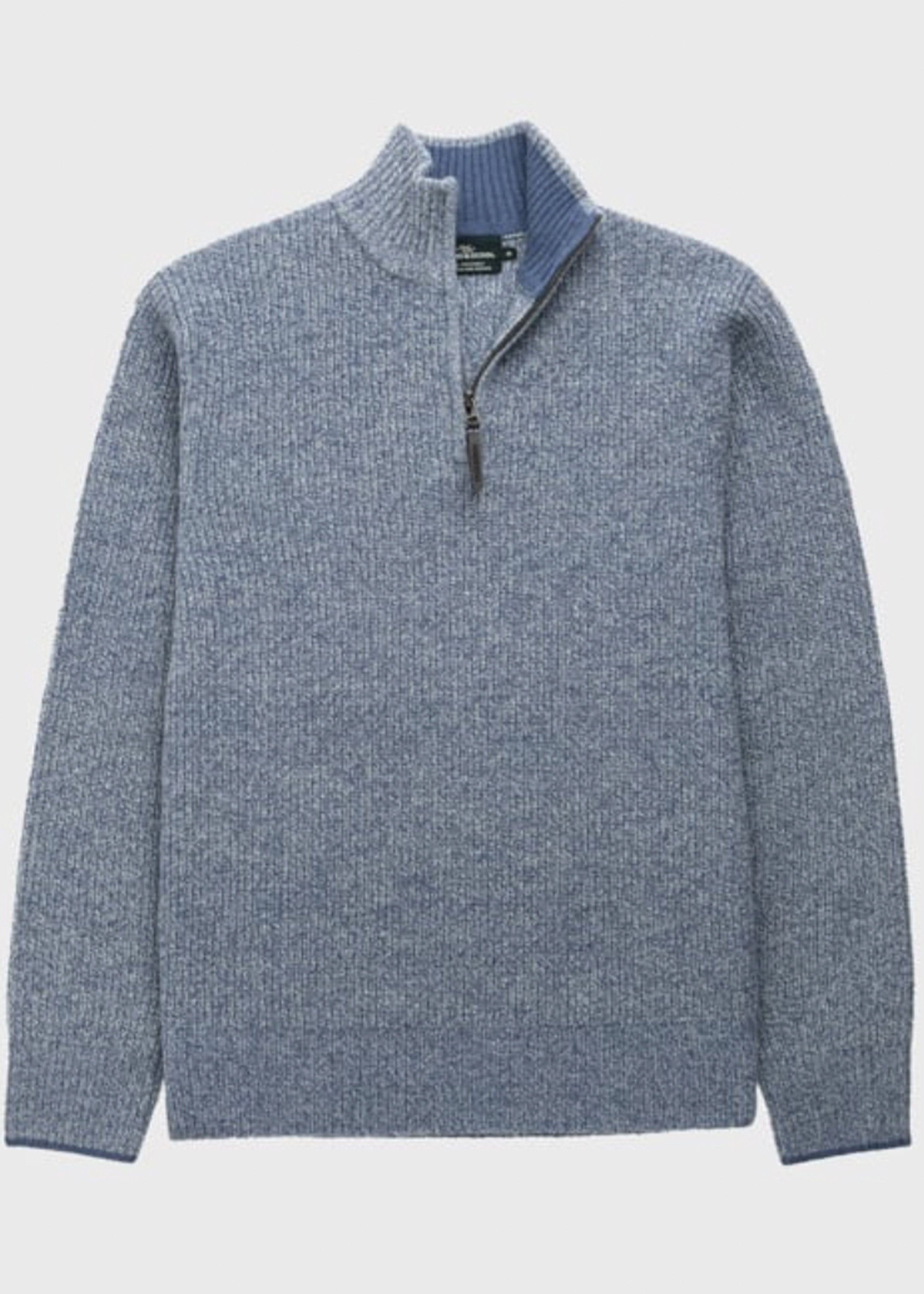 This sweater is expertly crafted from an extra fine lambs wool, textured with a melange yarn. Spun in Italy, knitted with a rib texture on the body, jersey side seams and sleeves, and trimmed with premium YKK zip front.
