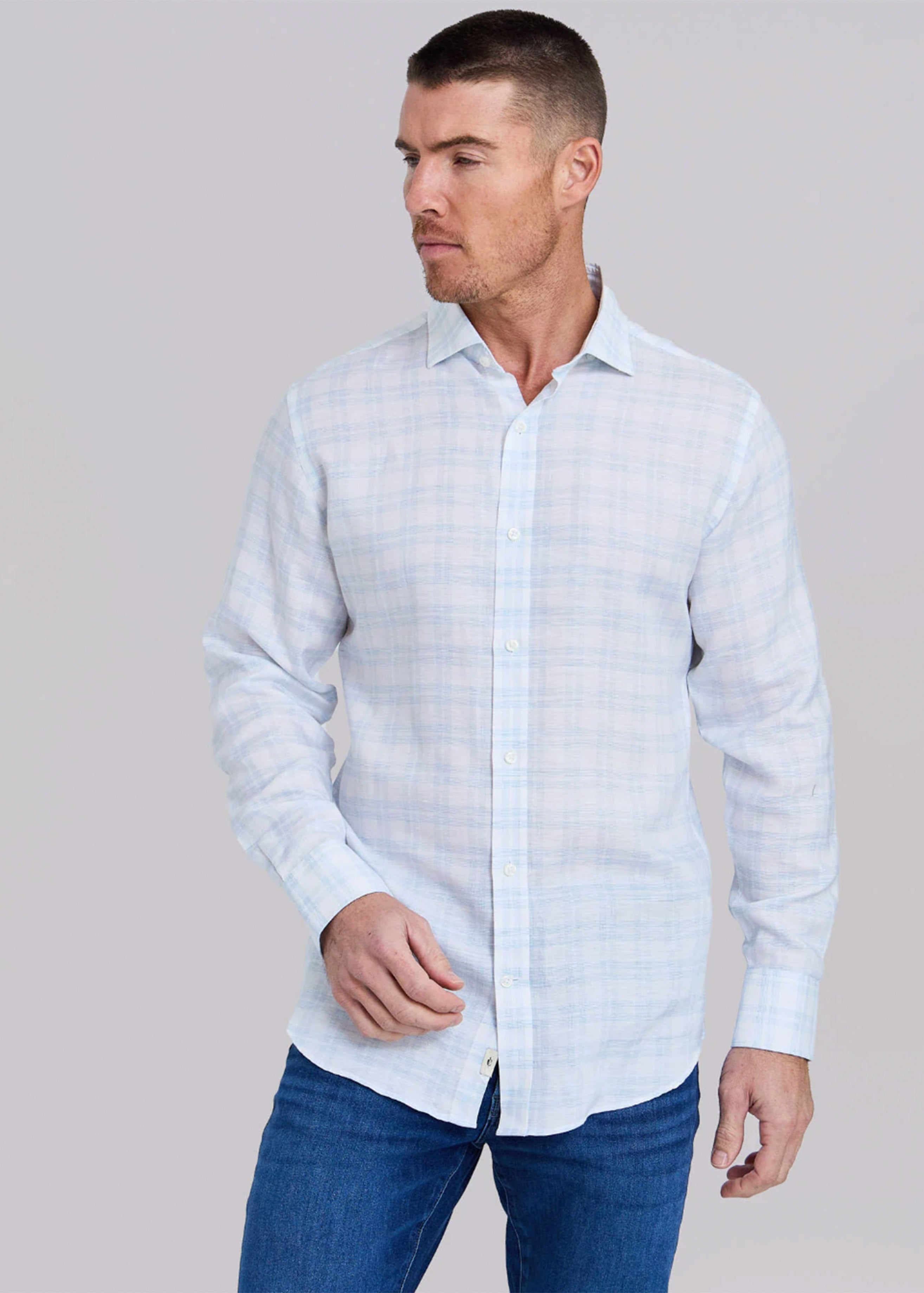 Rye 51 The Phoenix Stretch Linen Sport Shirt | White and Teal Box Plaid