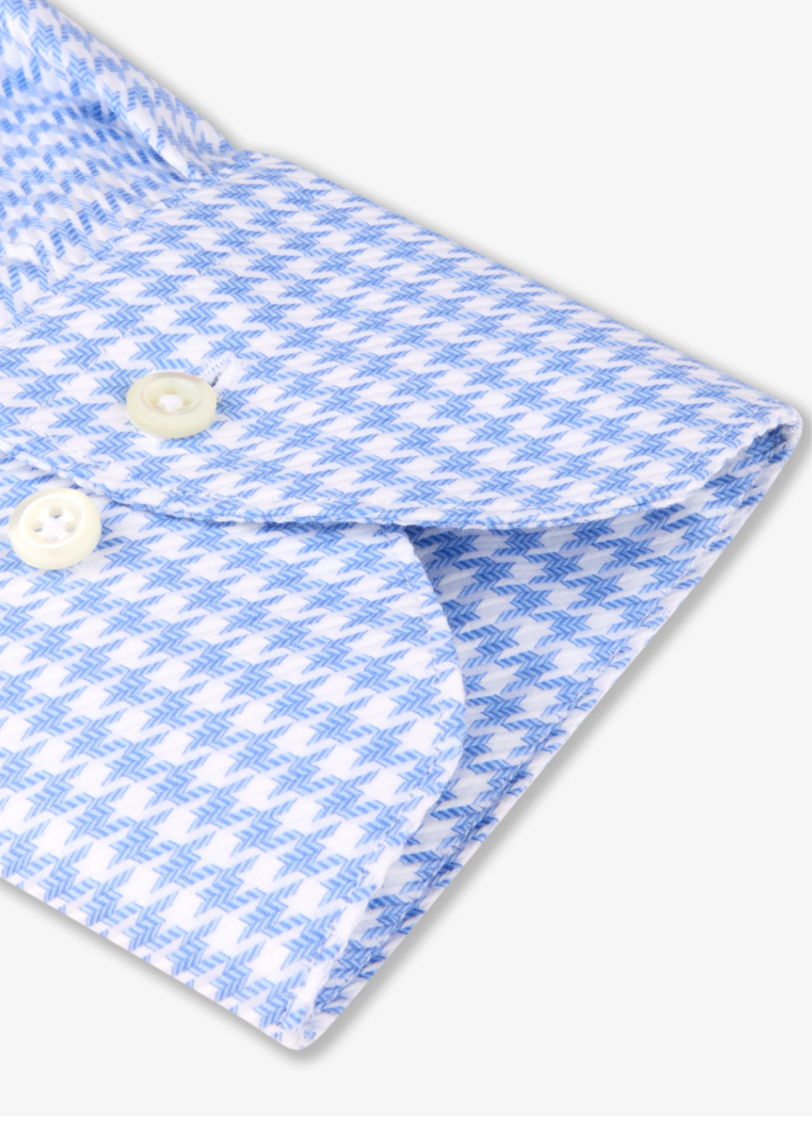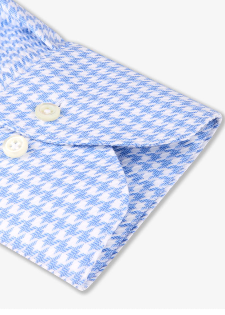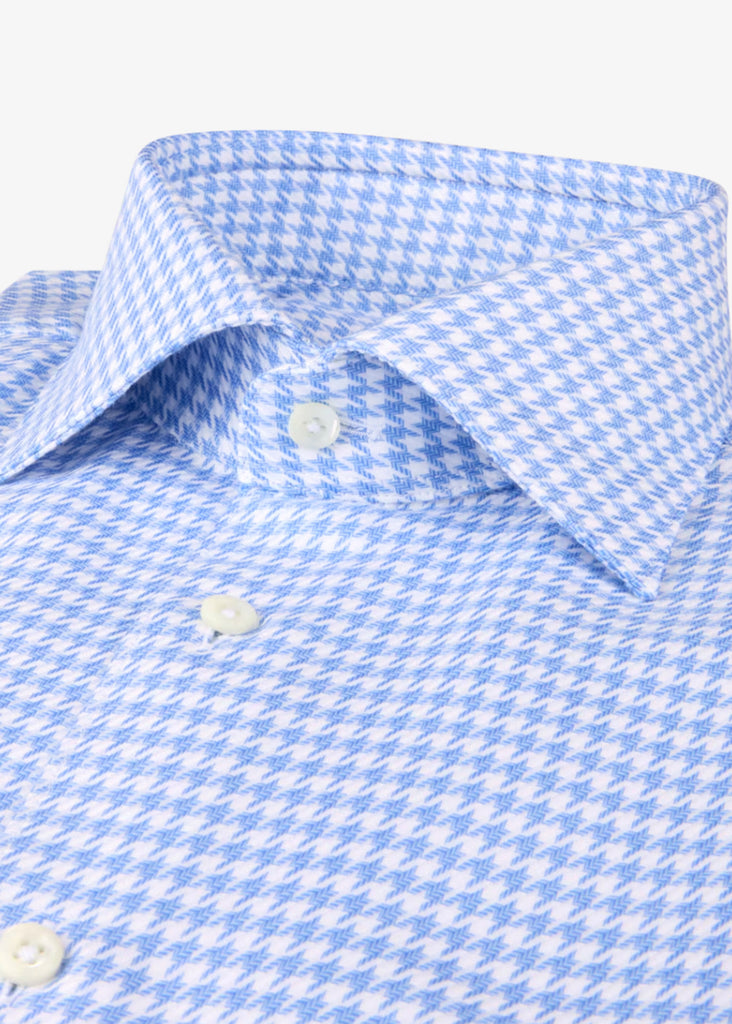 This checked twill shirt is made of twofold cotton. The shirt is detailed with mother of pearl buttons, single cuffs and a cut away collar.