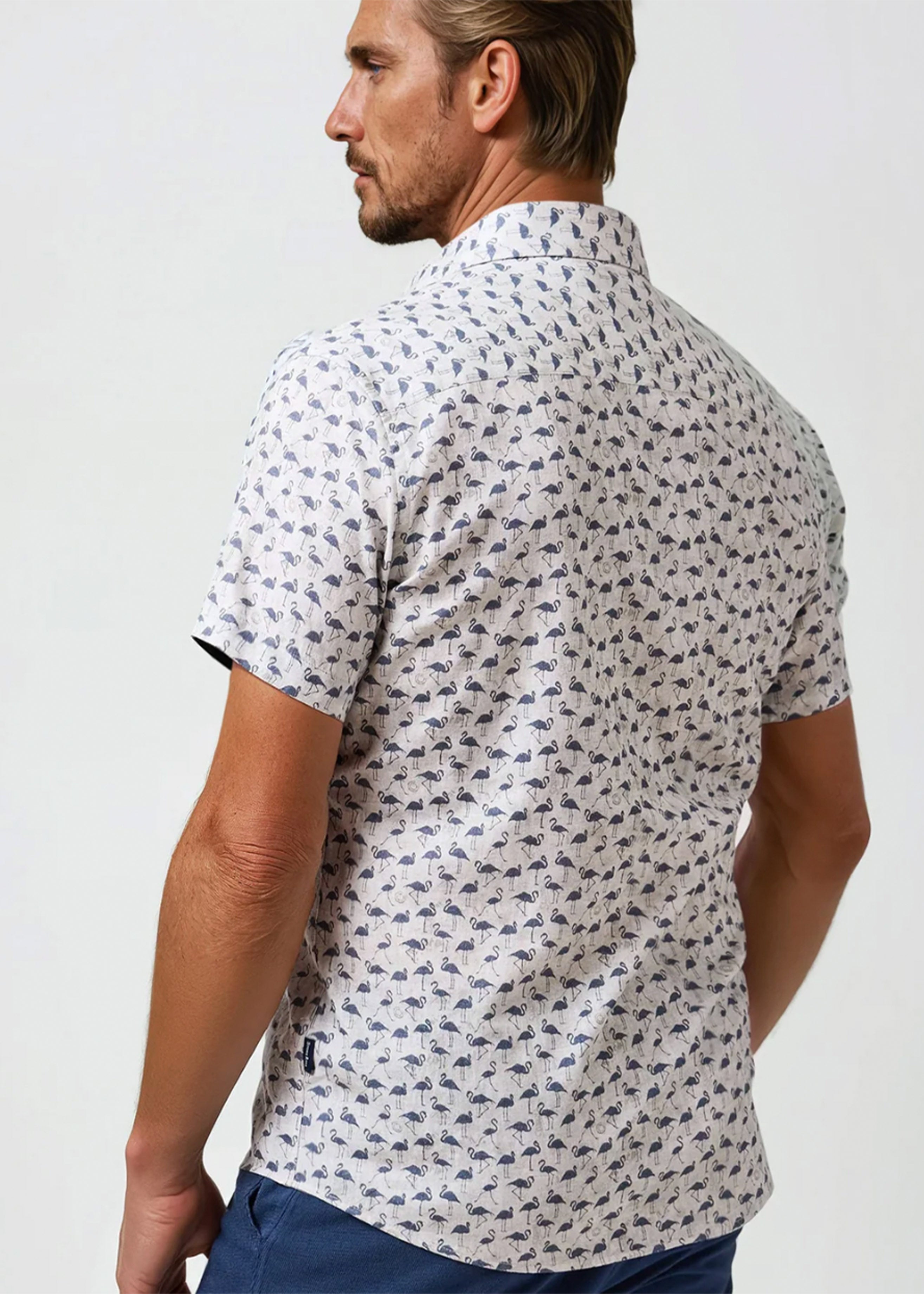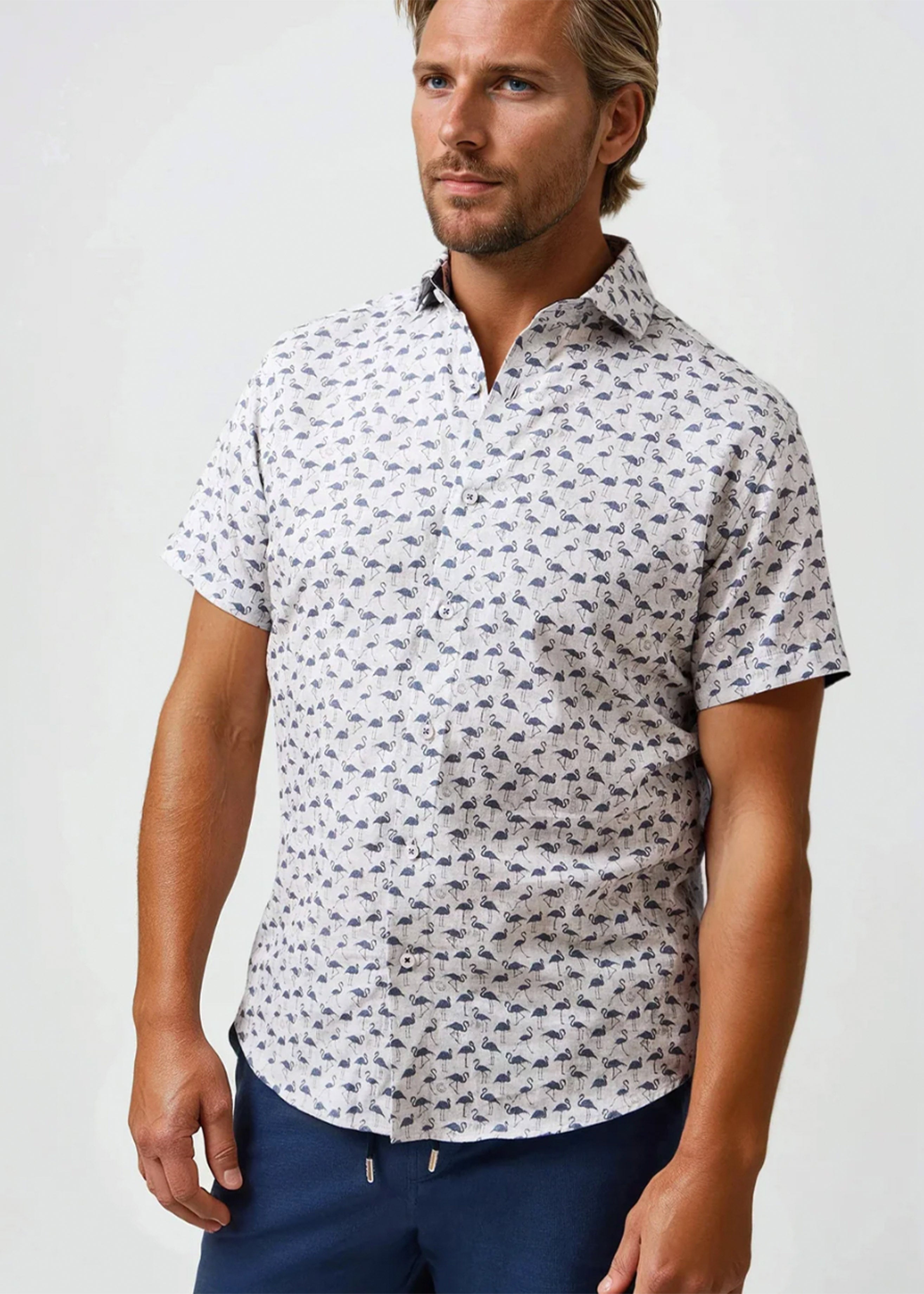 The Beige Flamingo Affair Linen Shirt from our Buonasera Collection blends relaxed refinement with elevated texture. Crafted in a printed cotton-linen blend, this effortless essential delivers breathable comfort with timeless character.