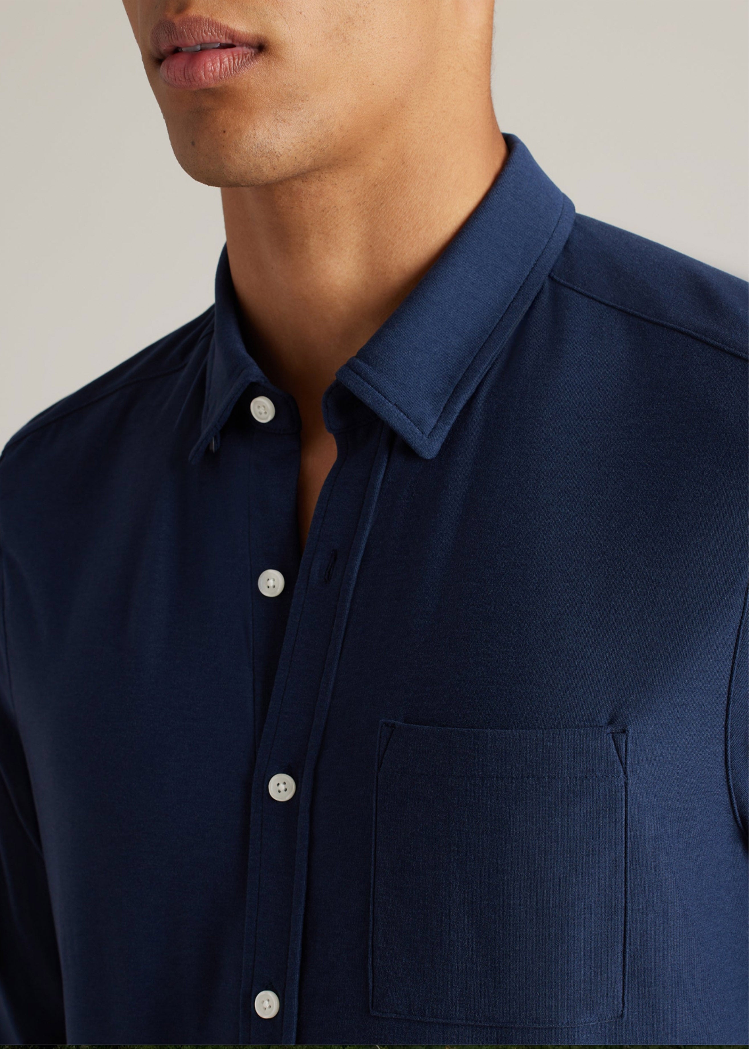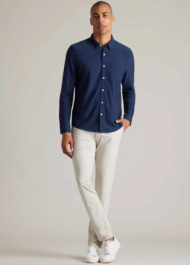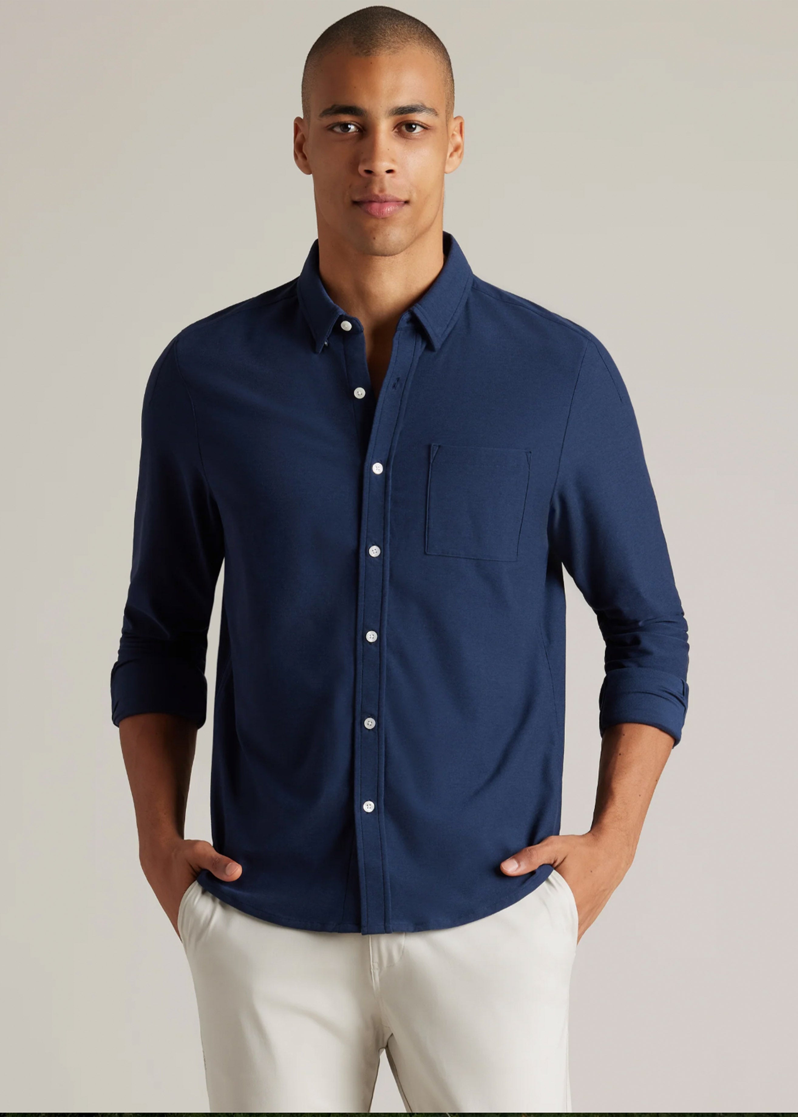 The term WFH is known far and wide these days, but this shirt wasn't just made to be kept cooped up inside - on the contrary! This shirt was made to make you feel comfortable regardless of almost anything else. The lightweight brushed fabric is knit, so it manages sweat and heat with ease but it also provides a ton of flexibility for whatever comes next. Pair that with the perfect classic fit and rounded hem so it can be tucked or untucked, this shirt is going to be an instant customer favorite.