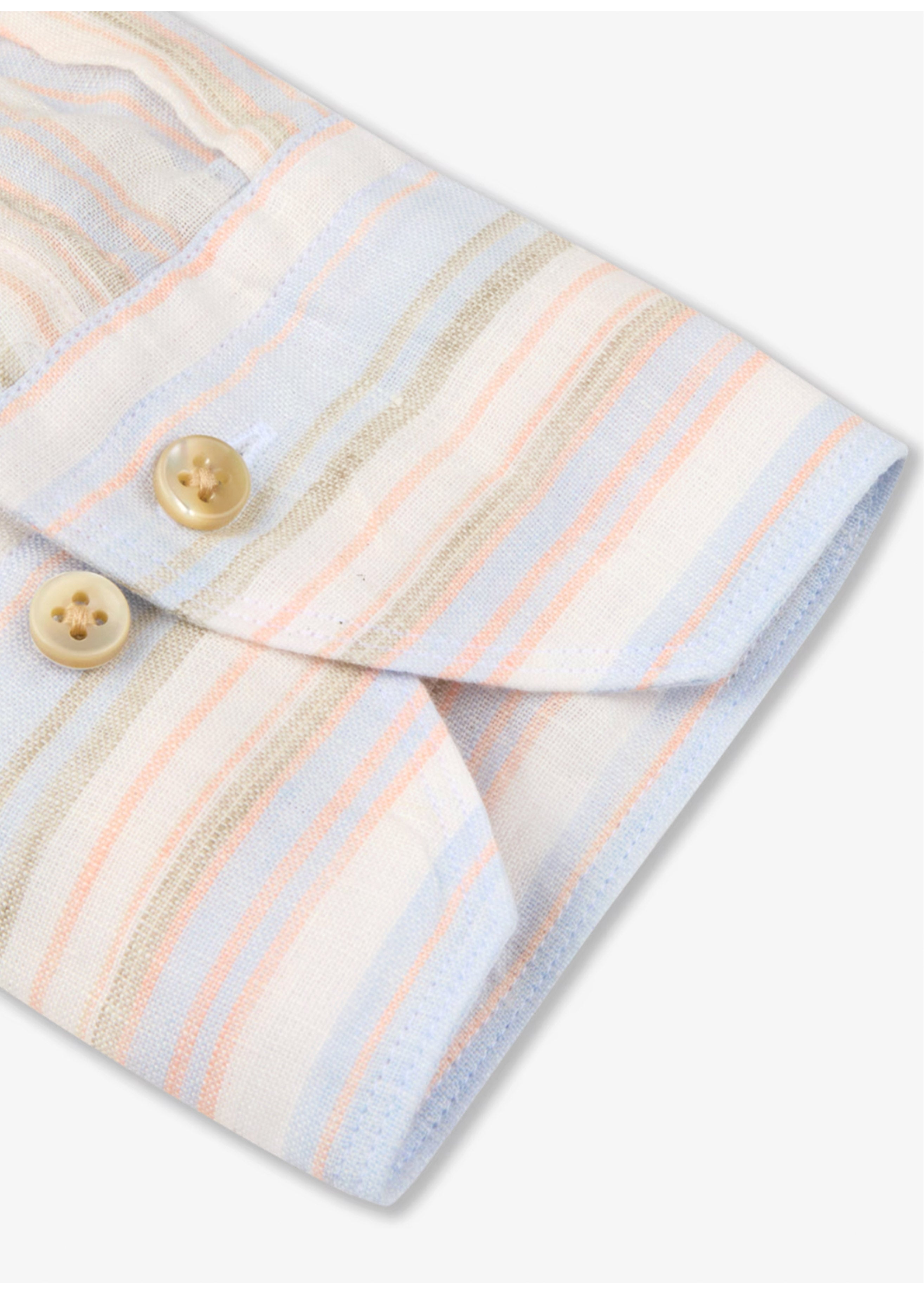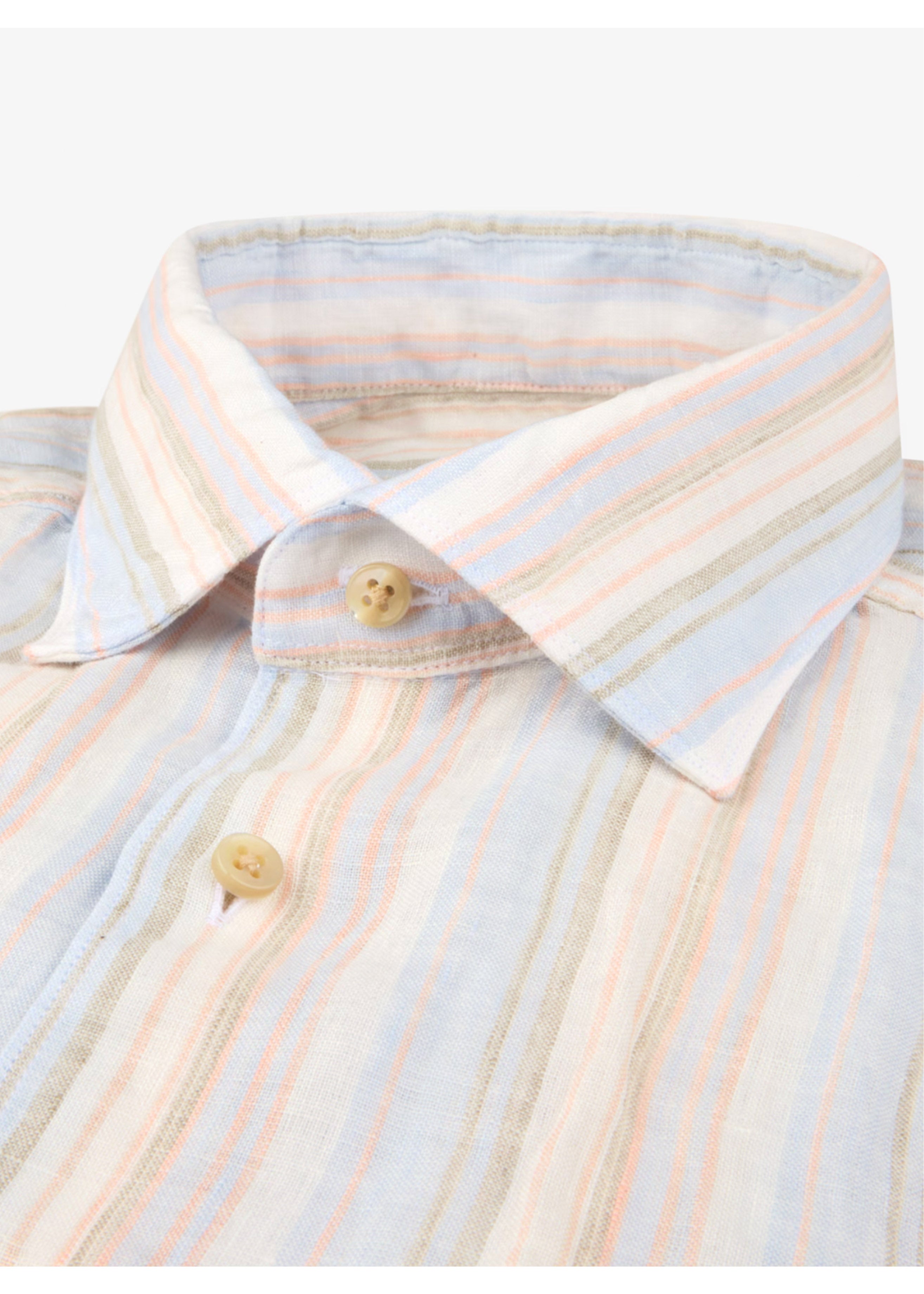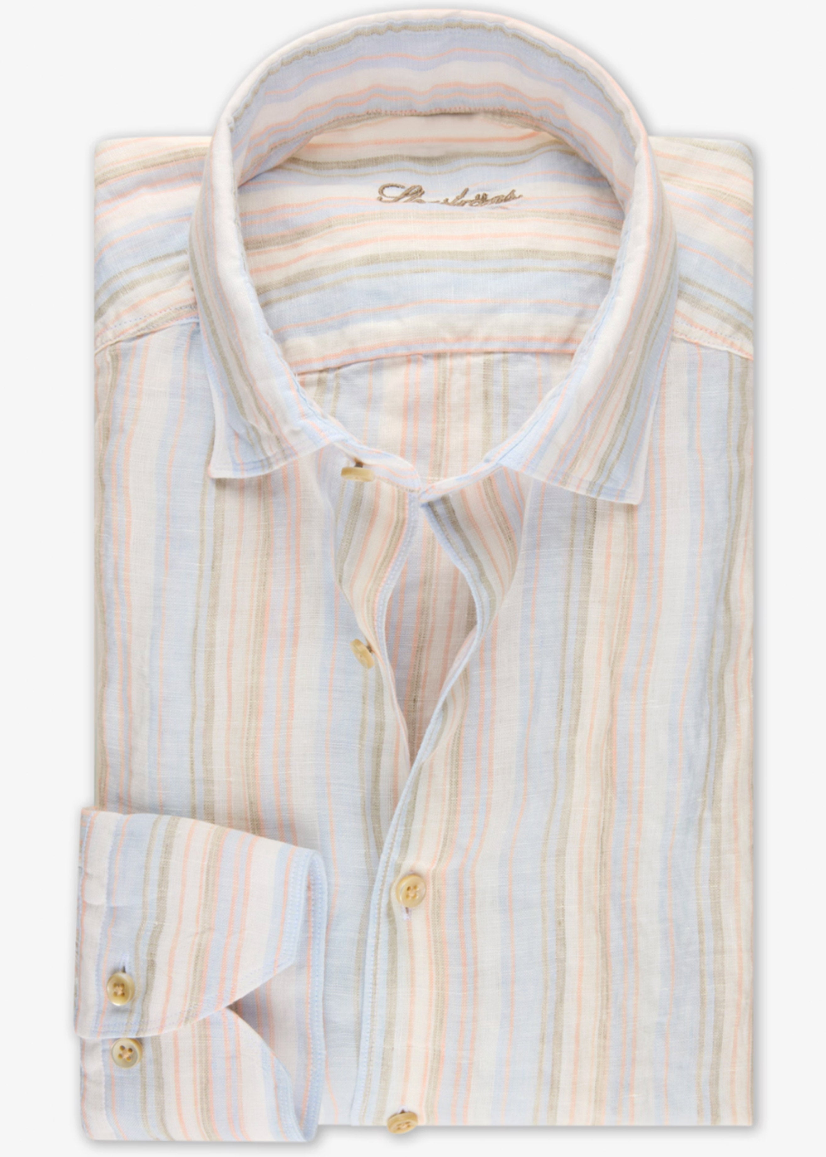 This striped shirt is made of linen and is detailed with mother of pearl buttons, single cuffs and a cut away collar.