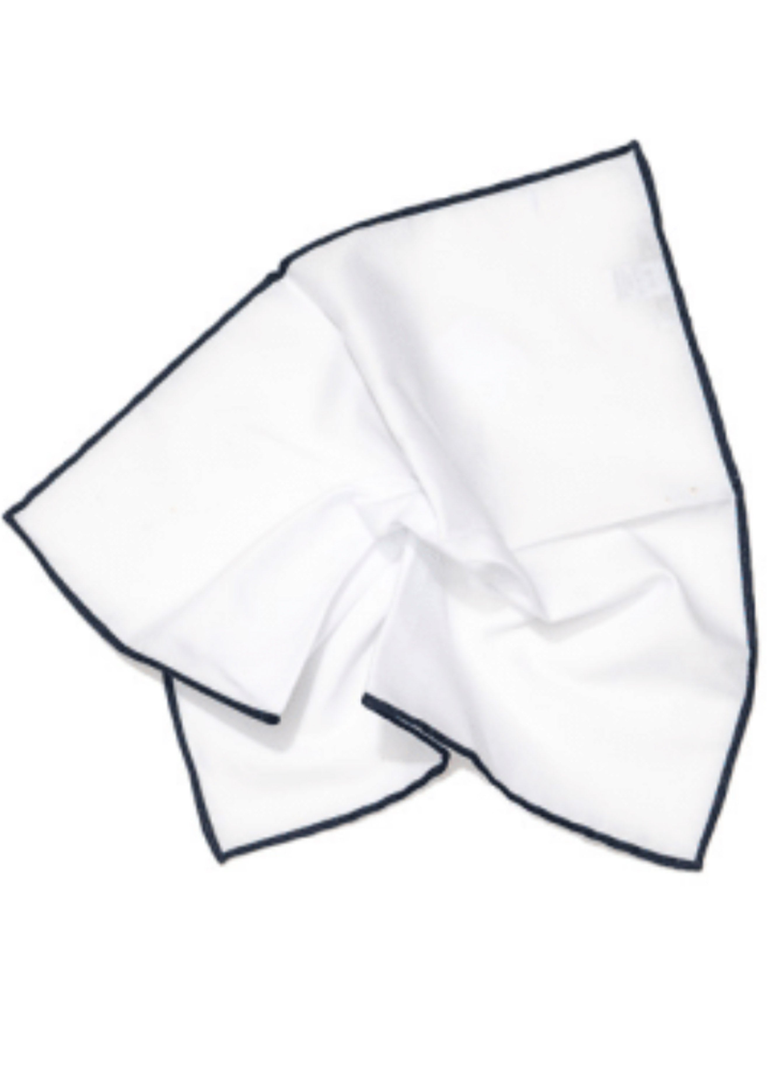 Edward Armah Cotton Pocket Square | White with Navy Trim is backordered and will ship as soon as it is back in stock.