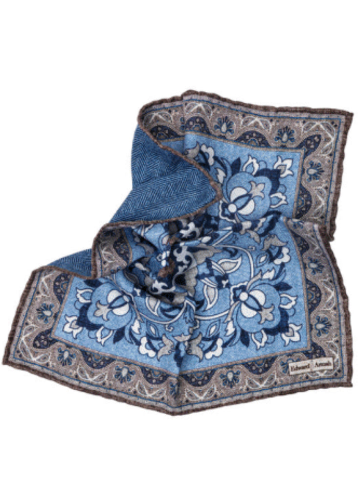 Edward Armah Floral Vine and Herringbone Print Reversible Pocket Square | Denim