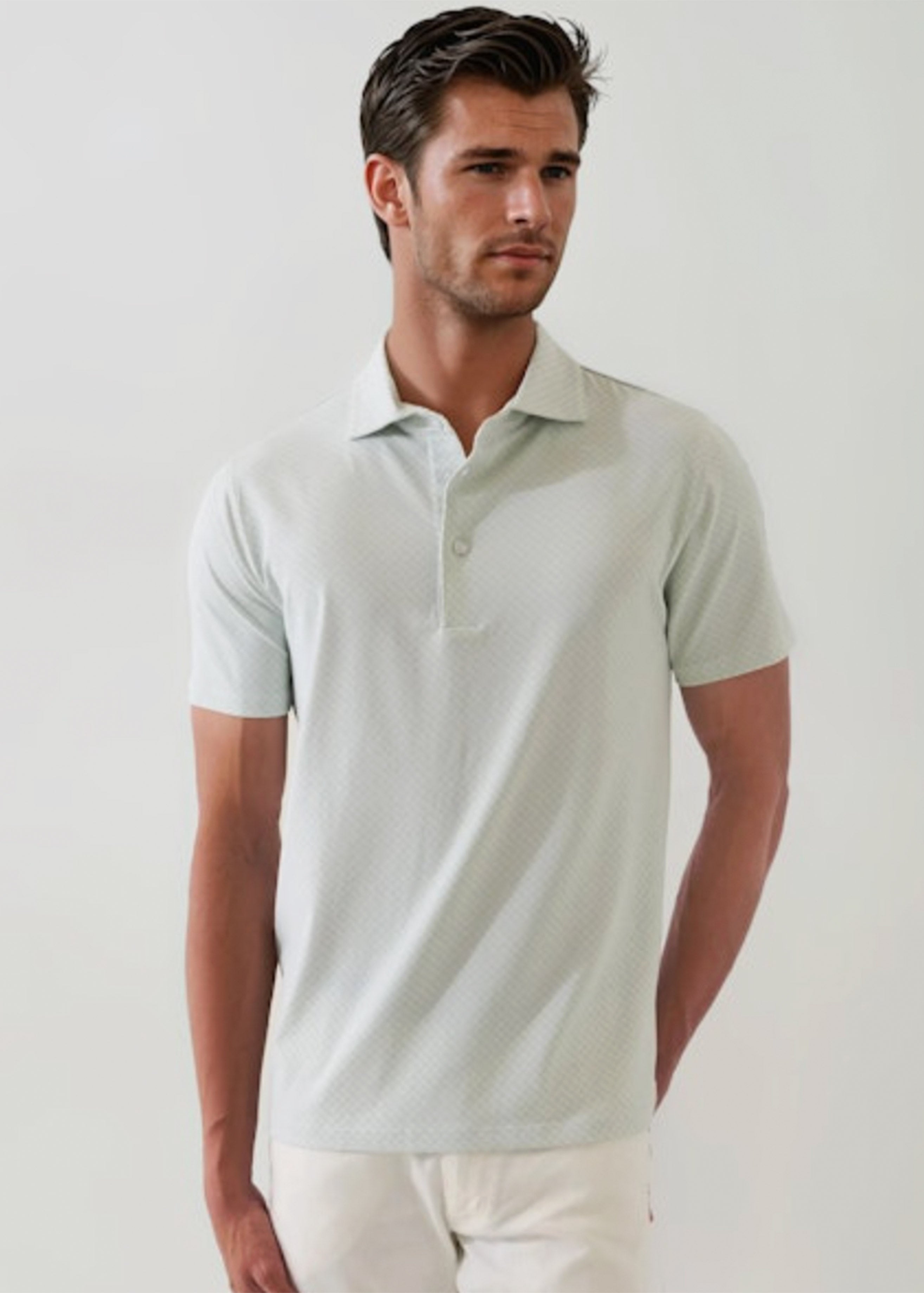 Crafted from an ultra-soft cotton blend with a touch of stretch, this polo delivers a refined approach to everyday comfort. A subtle geometric print lends understated character, while the modern fit and breathable fabric make it an effortless choice for warm-weather style.