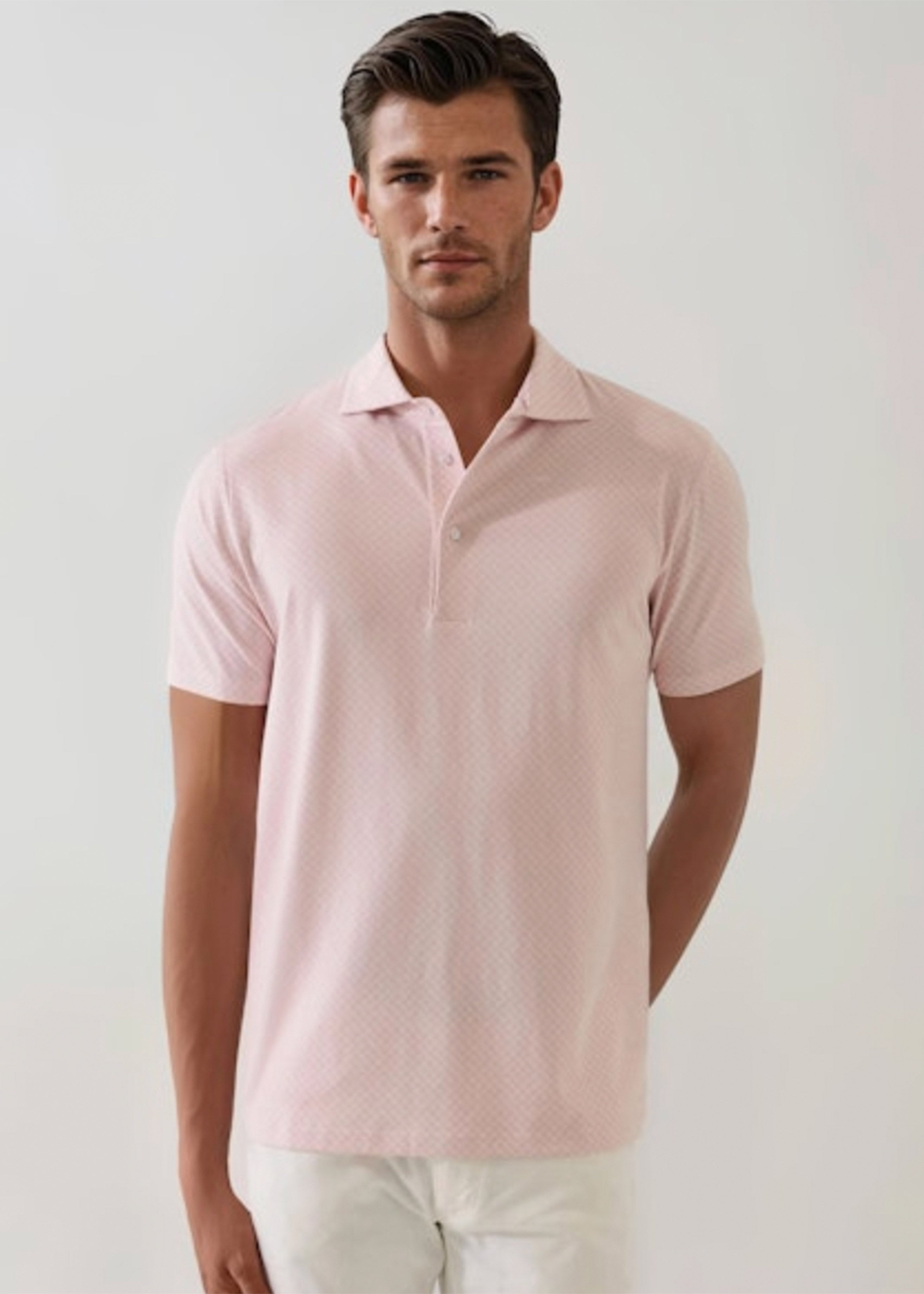 Crafted from an ultra-soft cotton blend with a touch of stretch, this polo delivers a refined approach to everyday comfort. A subtle geometric print lends understated character, while the modern fit and breathable fabric make it an effortless choice for warm-weather style.