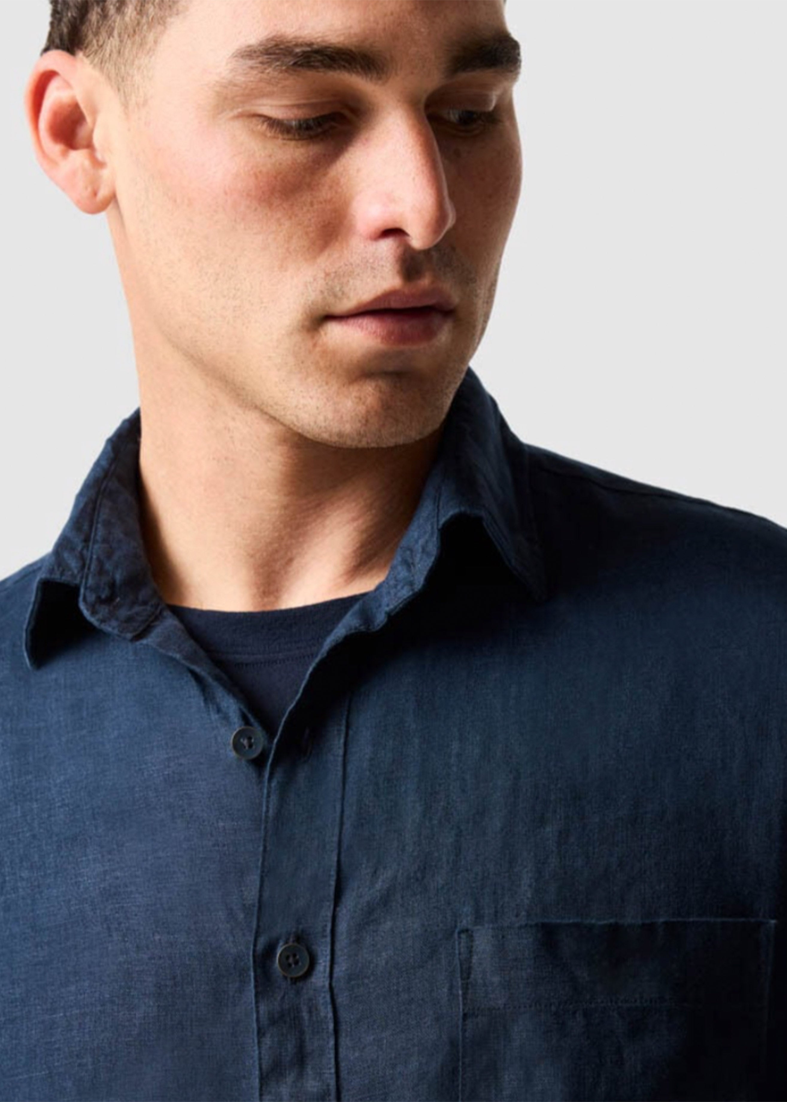 This shirt is woven from yarns that feature a unique delave wash, which lends the fabric a slightly faded look and soft feel. Milled in Italy, from premium linen harvested in France and Belgium and certified by European Flax. Pre-washed for easy going feel, the fabric will continue to soften over time and with each and every wash.